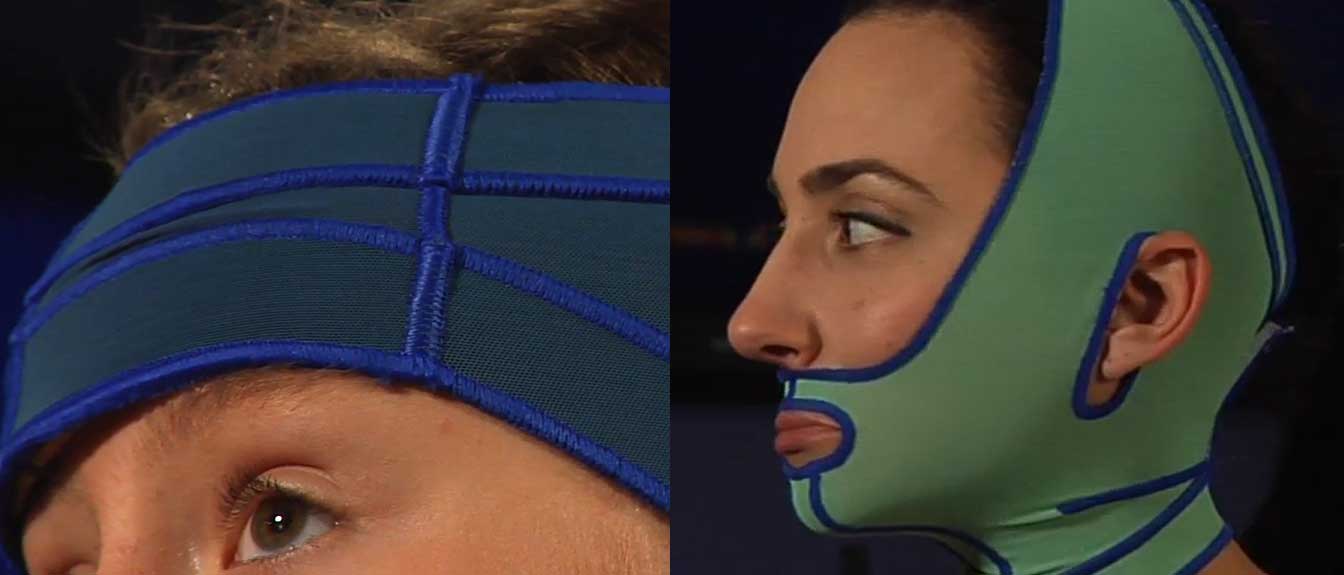 Ear, eye, mouth, and nasal holes on the face masks and chin straps may be omitted. This may be a very useful option if it is intended to install an orthoplastic or gel device under the garment, using it to hold the device in place. Alternatively, the therapist may wish to cut a hole in order to minimize the area exposed. Our fabrics do not fray or unravel when cut, although some have a tendency to tear at an unfinished opening.